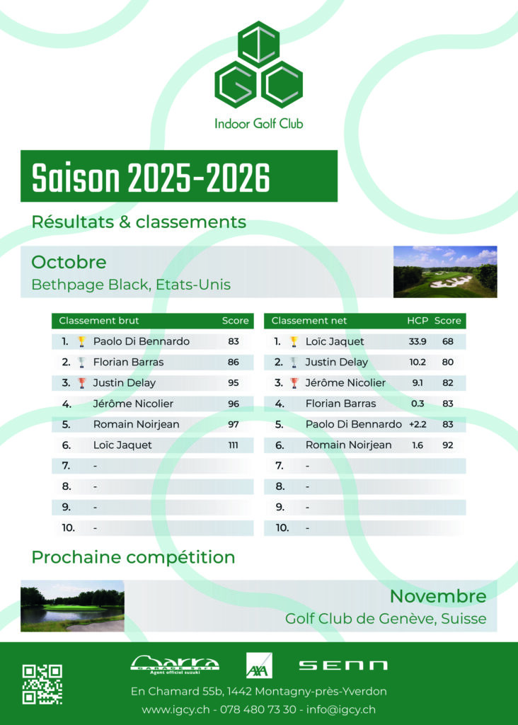 Nous avons le plaisir de vous annoncer les résultats du mois d’octobre de notre championnat organisé à l’Indoor Golf Club !